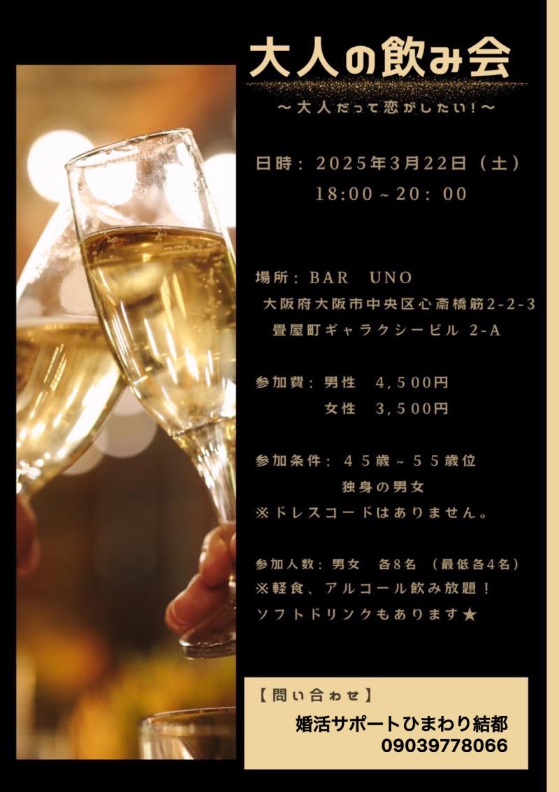 この度、大阪・心斎橋にあるBAR UNOにて、婚活ミドル世代を応援する「大人の飲み会」を企画しました。