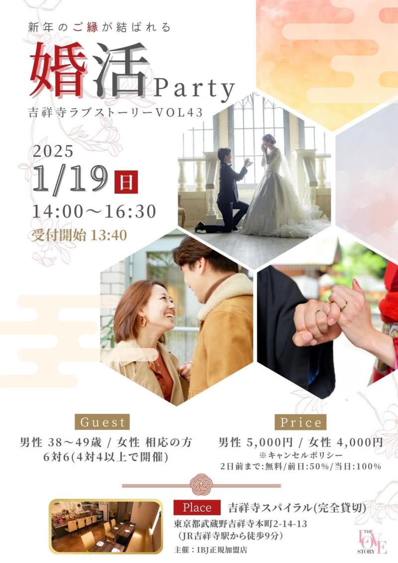 新しい年の始まりに、素敵な出会いを求めて婚活パーティーに参加しませんか?「吉祥寺ラブストーリー」は、38~49歳の男性と、その年齢層に合う女性を対象とした真剣な婚活イベントです。6対6(4対4以上)での開催となり、落ち着いた雰囲気の中でじっくり交流できます。